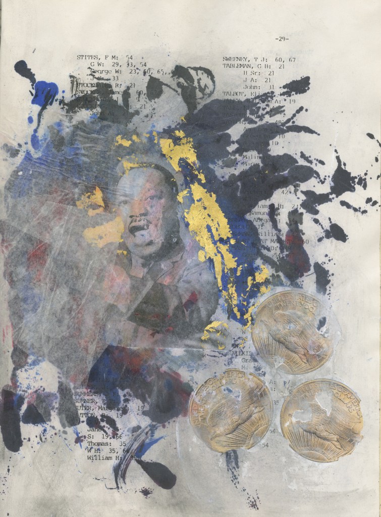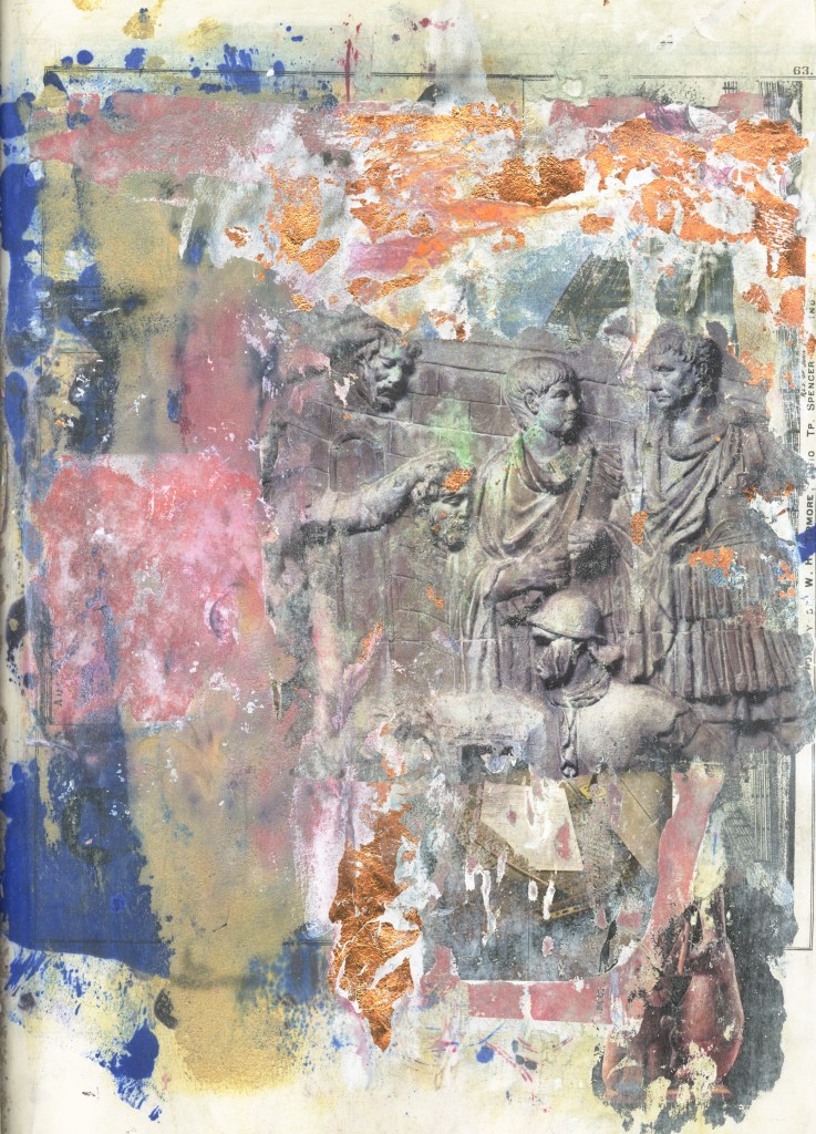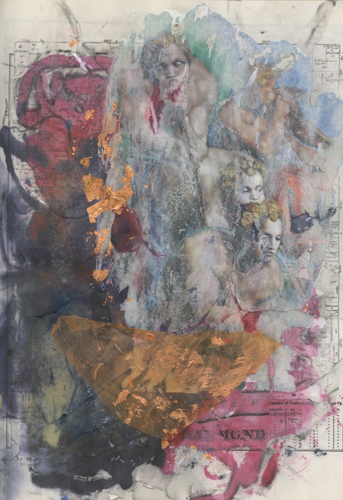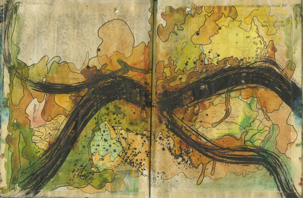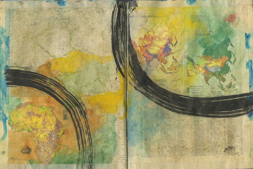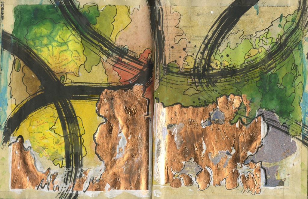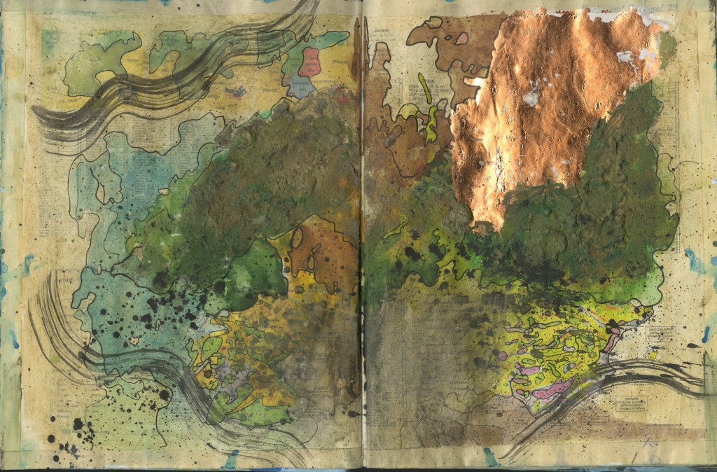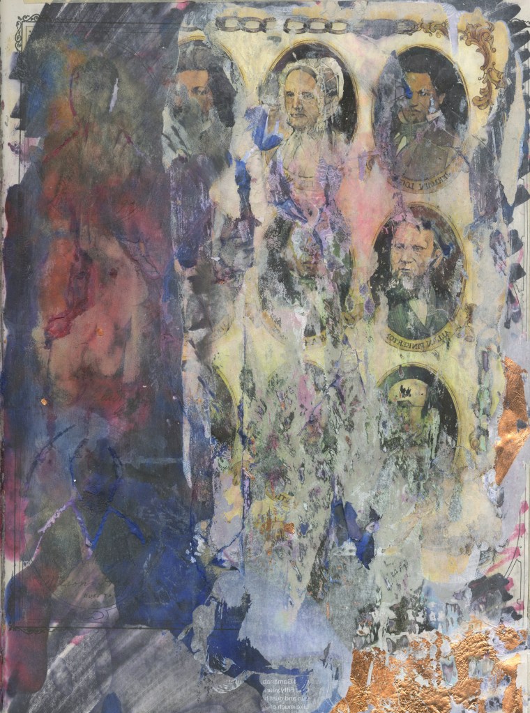 Pages from recent artist book transformations. Studies on historical figures and ideas on the environment. Various materials and books.