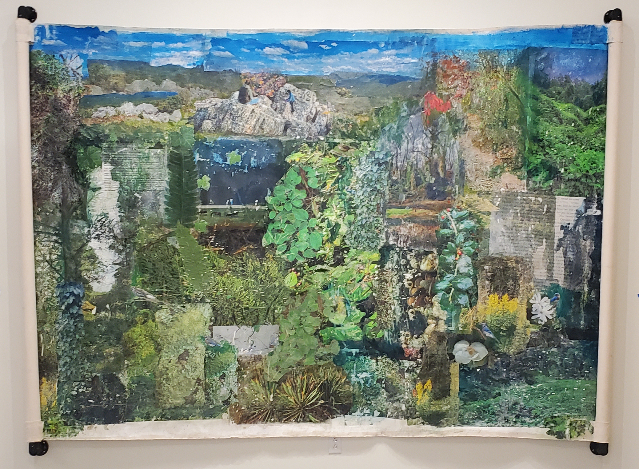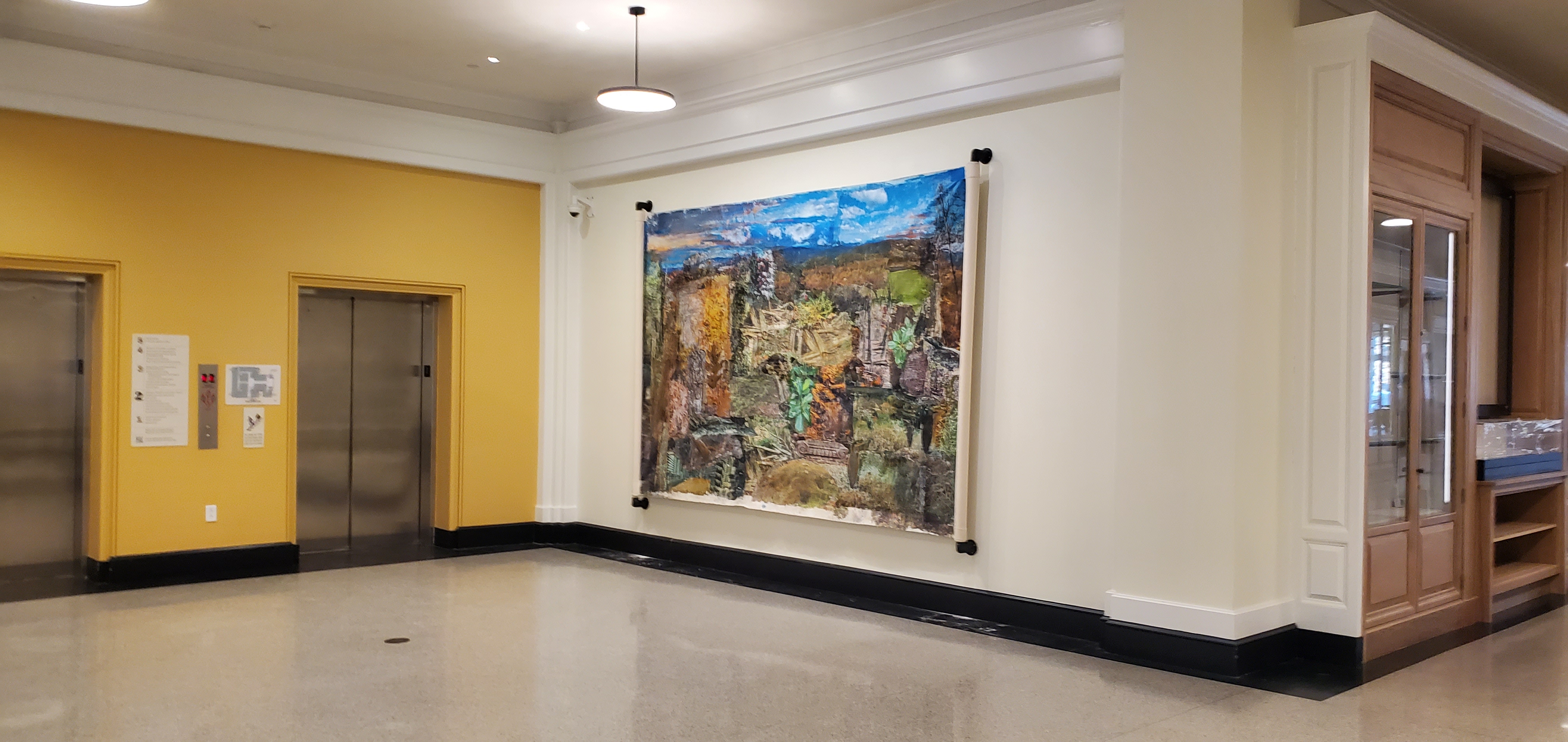 Installation at Shannon Library at the University of Virginia, installation view. A collection of image transfers onto gessoed canvas, acrylic, watercolor, and coloring pencils. All images are from the state of Virginia during different times during the year of 2024. Installation from January-December 2025.