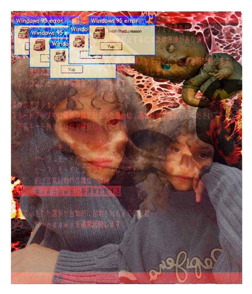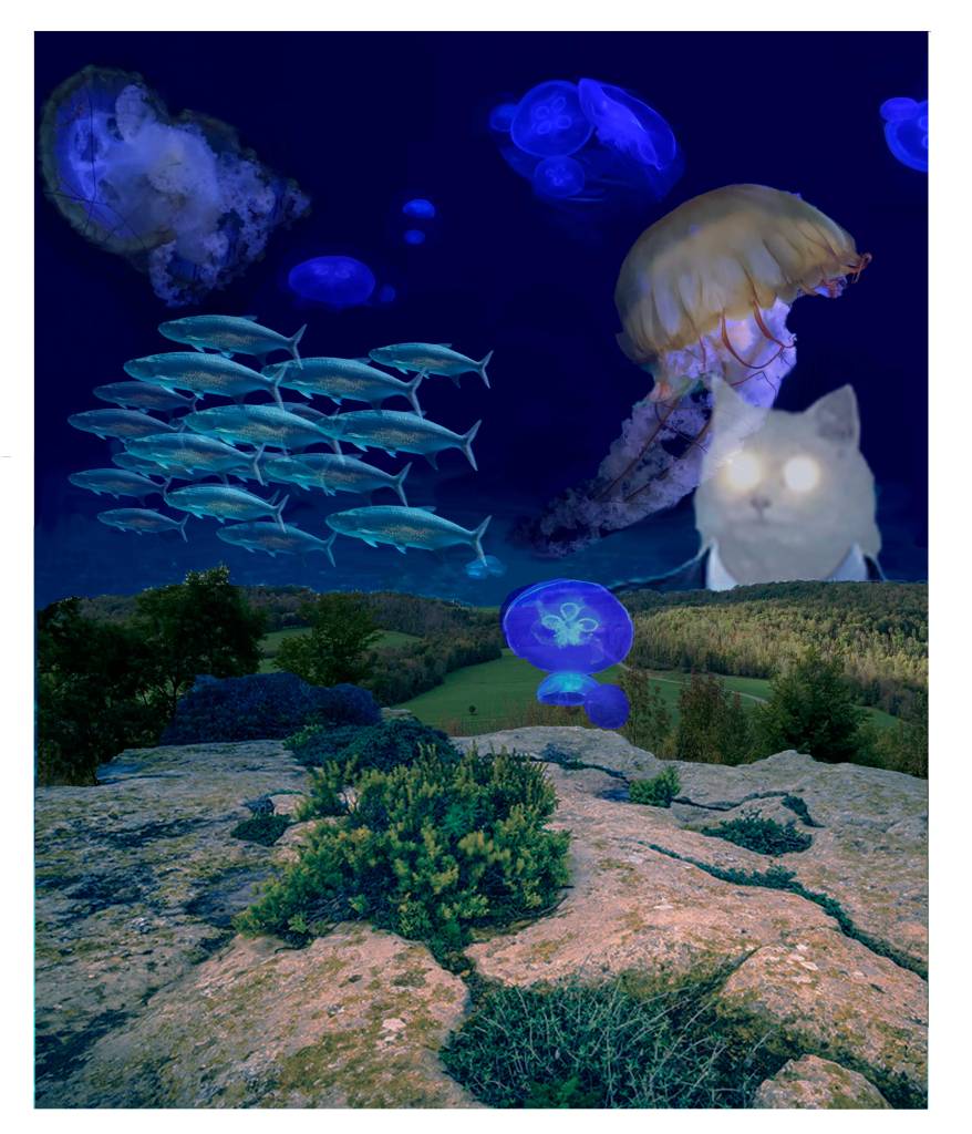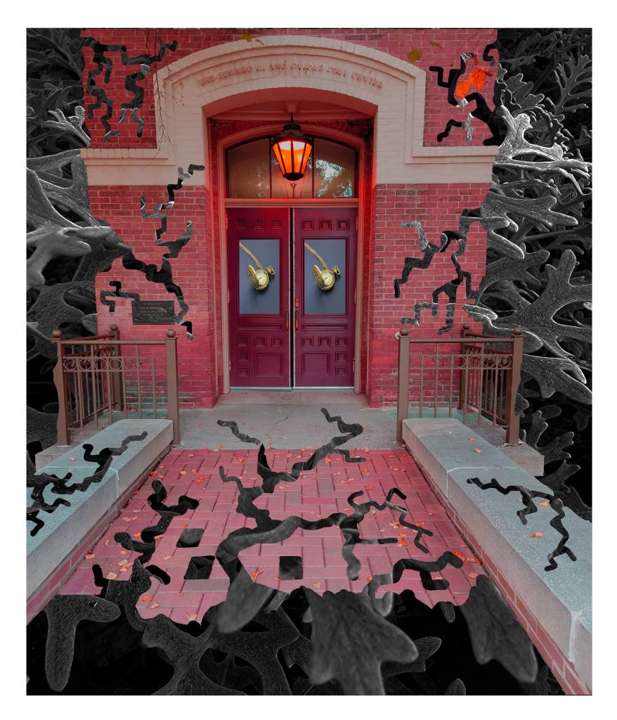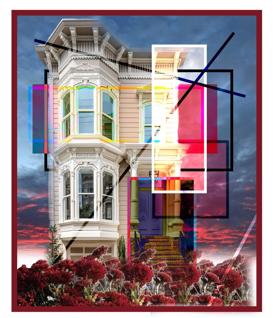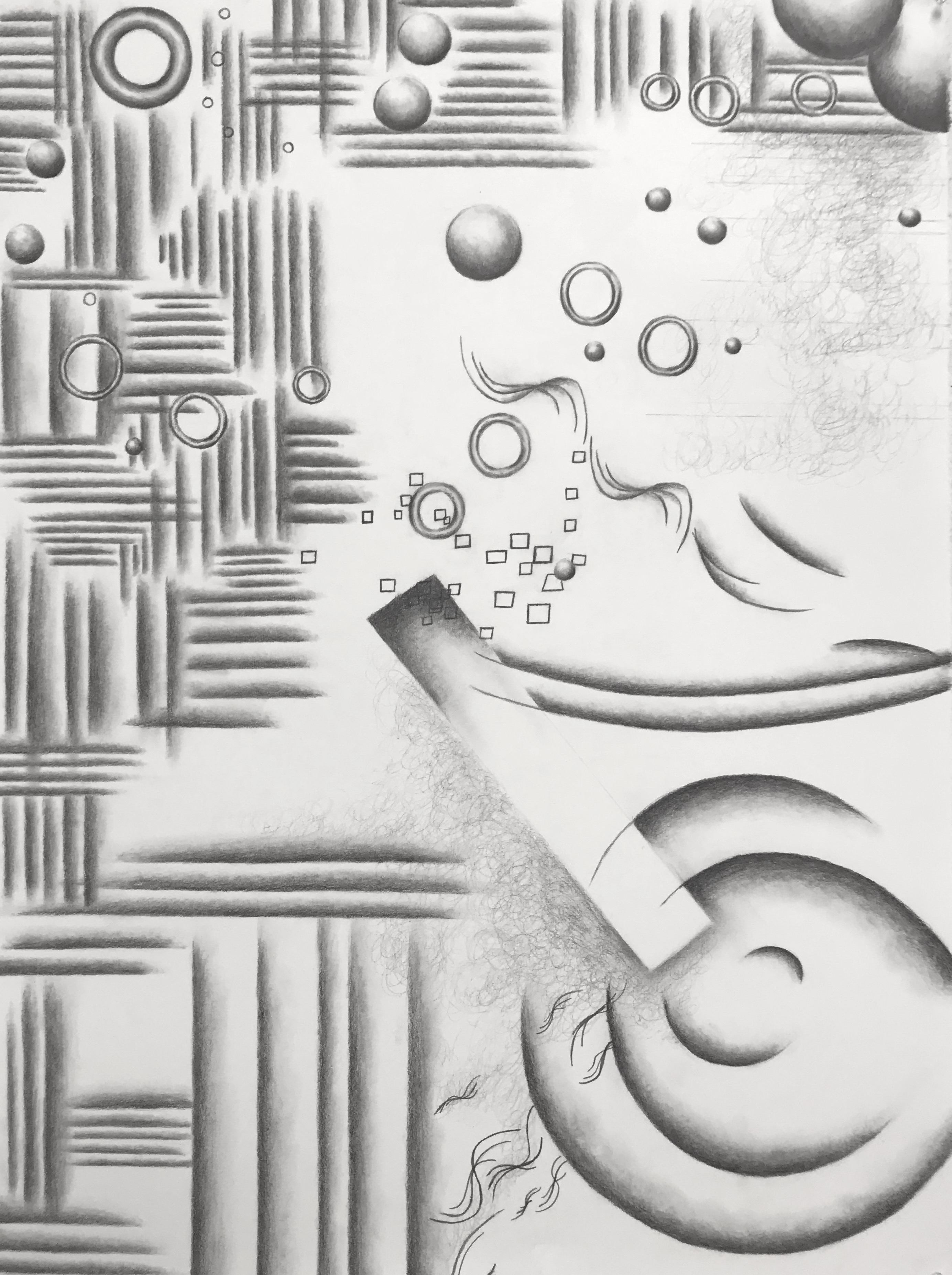Images created using Photoshop. Students used masks, found images, custom brushes, erasers, and other tools in Photoshop. The final image was printed on 24×28 inches matte paper.