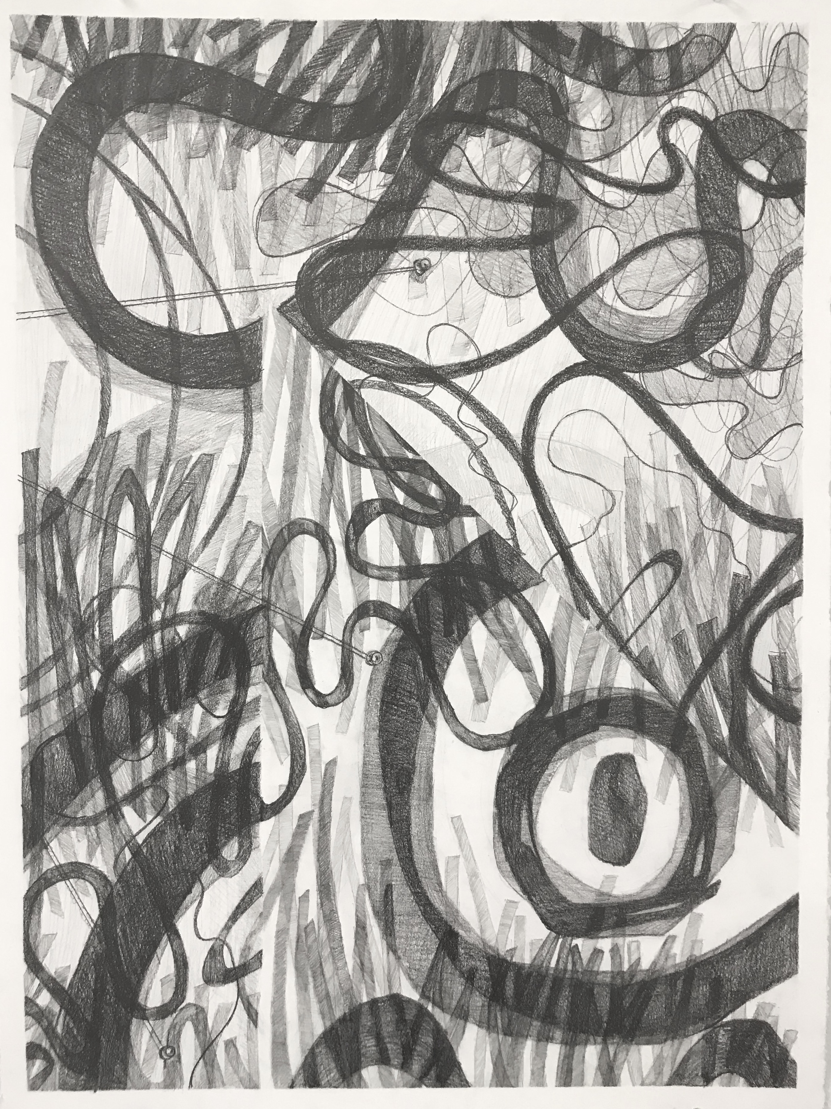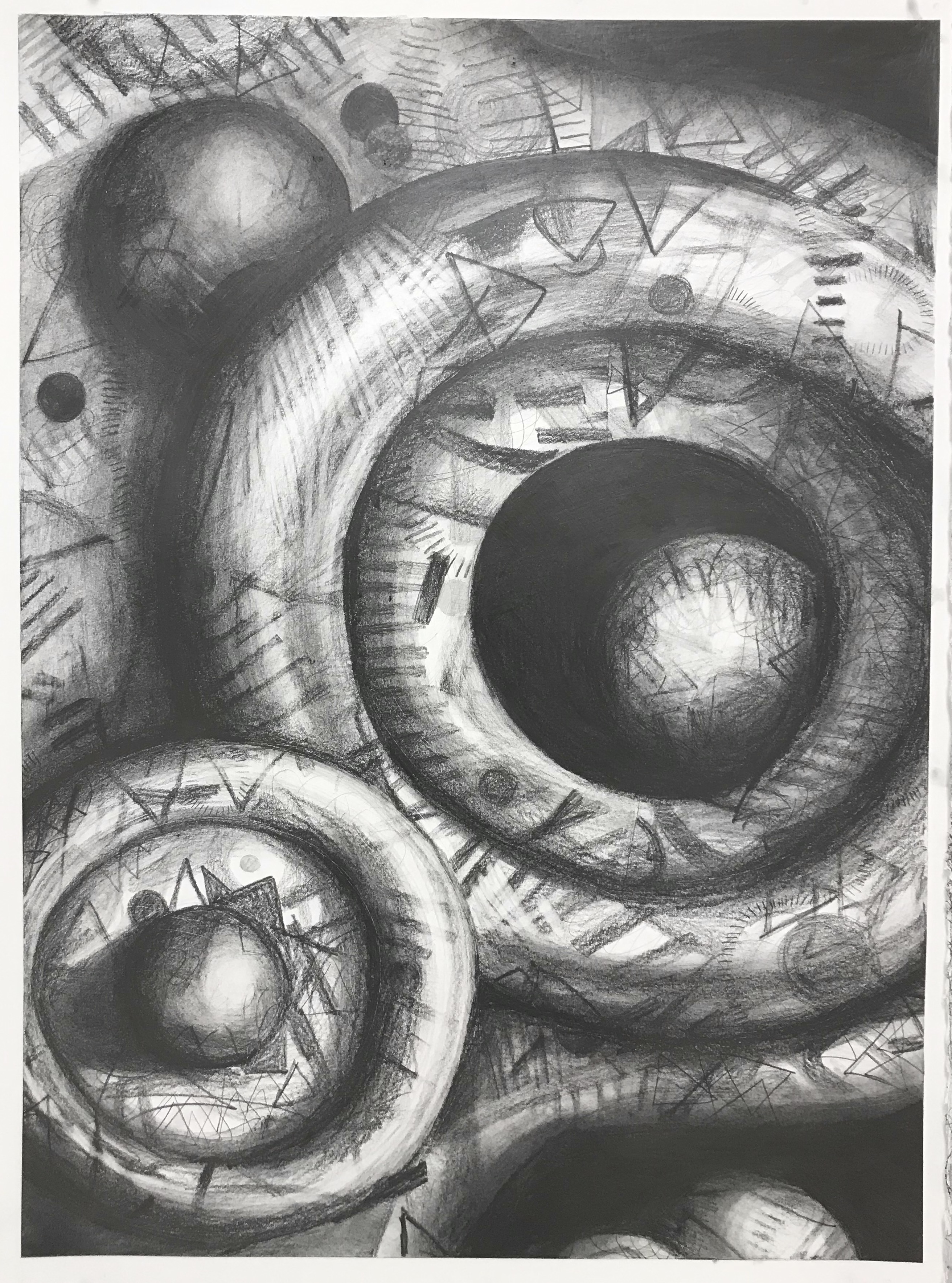 Foundation students samples of drawing projects developed from chance operations. Students developed drawing key, installation space, viewfinder sketches, and a final drawing reflecting their research and examination of spatial installation.